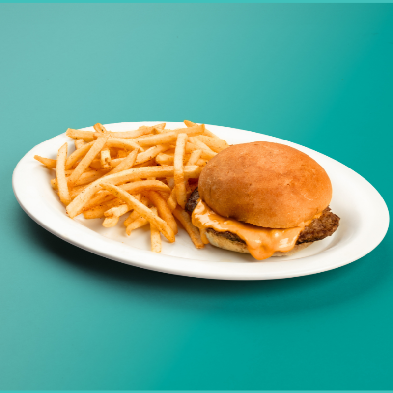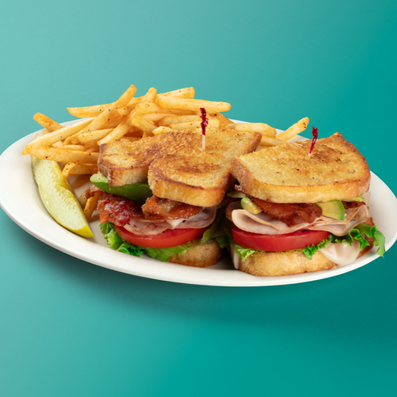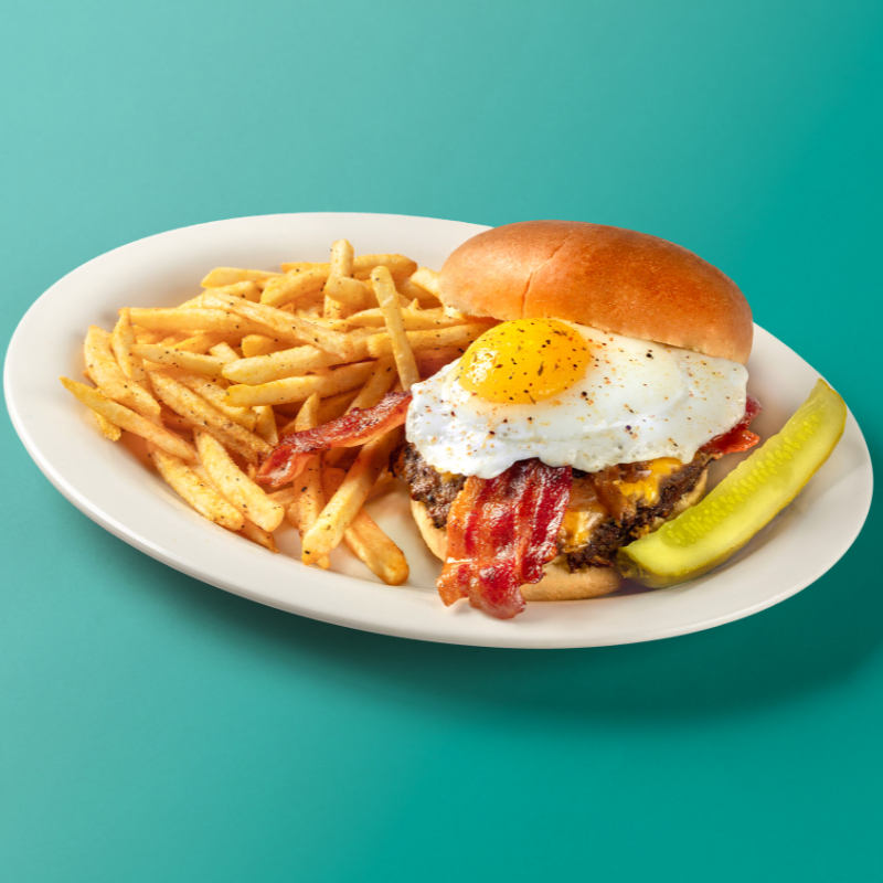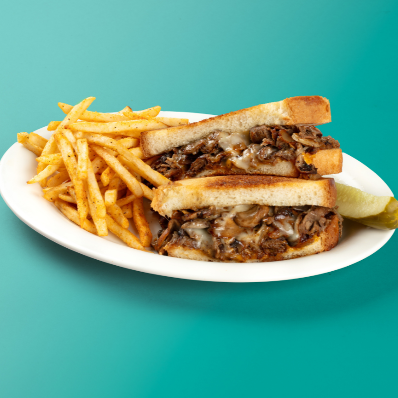 Our juicy burgers are crafted with two 3.2 oz steak burger patties. Burgers and sandwiches are served with a choice of french fries or home fries and of course, a pickle.
